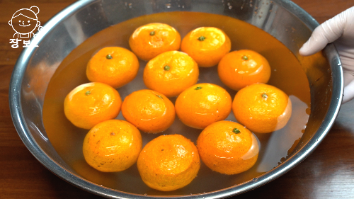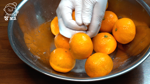1. 귤은 베이킹소다를 뿌리고 뽀득뽀득 닦은 뒤 5분간 물에 담가 잔류농약과 왁스를 제거한다.