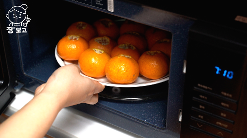 3. 쓴 맛이 나는 귤 꼭지 부분을 떼어주고 전자레인지 접시에 담는다.
