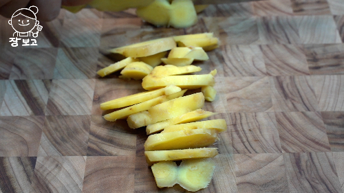 6. 생강을 편 썬다. 생강을 좋아한다면 귤과 함께 갈아도 좋다.