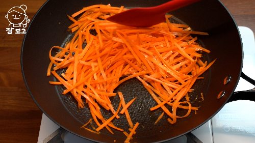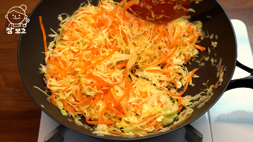 3. 웍에 오일 두르고 당근을 넣어 볶다가 반정도 익으면 양배추, 양파를 넣고 소금 후추 넣는다.