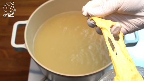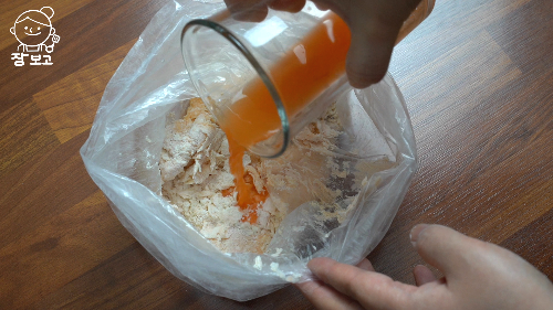 봉지에 다목적용밀가루 2컵과 당근절임물, 식용유 약간을 넣어 치대 수제비 반죽을 만들었다.