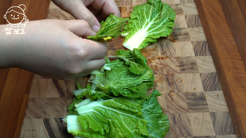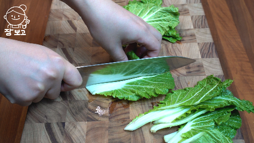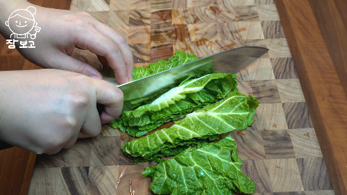 5. 봄동 중간잎은 세로로 썰고, 작은 건 손으로 찢는다. 큰 잎은 사선으로 썬다.