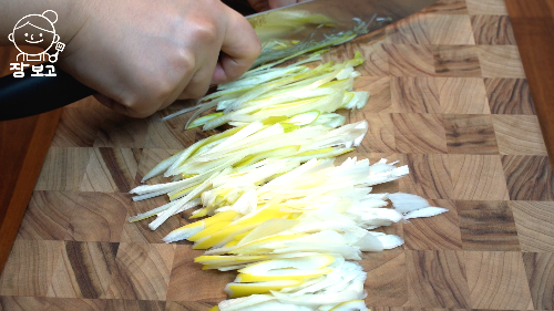 6. 대파 흰 부분 어슷 썰고, 홍고추는 씨를 빼고 채 썬다.