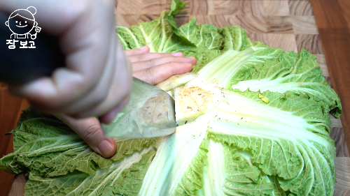 1. 봄동은 뒤집어서 뿌리 쪽에 사각으로 칼집을 낸다. 이렇게 하면 딱딱한 심지만 쏙 빠지고 한장 한장 잘 떨어진다.