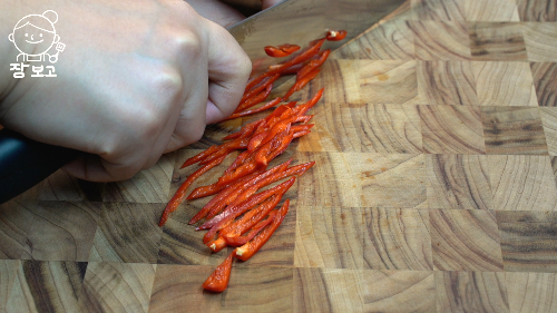 6. 대파 흰 부분 어슷 썰고, 홍고추는 씨를 빼고 채 썬다.