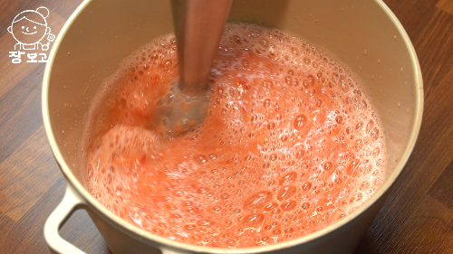 4. 토마토는 적당한 크기로 대충 썰어 믹서기 또는 핸드블랜더로 갈아준다. (뭉근하게 끓일거라 곱게 갈 필요 없다)