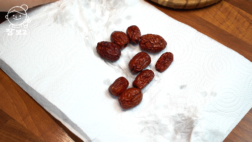 3. 불린 대추는 물에 헹궈 키친타월로 물기를 제거하고 돌려 깎아 씨만 빼낸다.