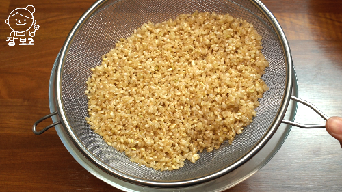 3. 1시간 뒤 잘 불려진 현미는 채에 탈탈 털어 밥솥에 붓는다.