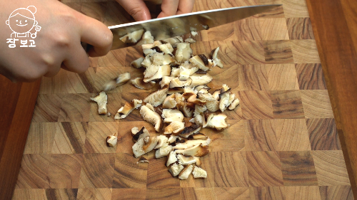 4. 불린 표고는 물기를 꼭 짠다. 버섯 불린 물은 밥에 써야 하니 버리지 말기~!