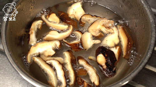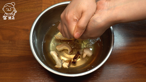 4. 불린 표고는 물기를 꼭 짠다. 버섯 불린 물은 밥에 써야 하니 버리지 말기~!