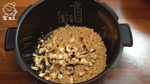 6. 표고 불린 물에 물을 추가로 넣어 총 310ml를 맞춰서 밥 솥에 붓고 잡곡밥 취사한다.
