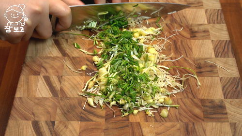 7. 깨끗이 씻은 달래 쫑쫑 썰고, 다진 마늘 1큰술, 고춧가루 1큰술, 매실청 2큰술, 양조간장 12큰술, 참기름 2큰술, 볶음통깨 1큰술 넣는다.
