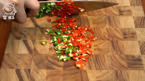 8. 매콤하게 먹고 싶다면 청양고추 1개, 홍고추 1개 다져 넣으면 훨씬 맛있다.