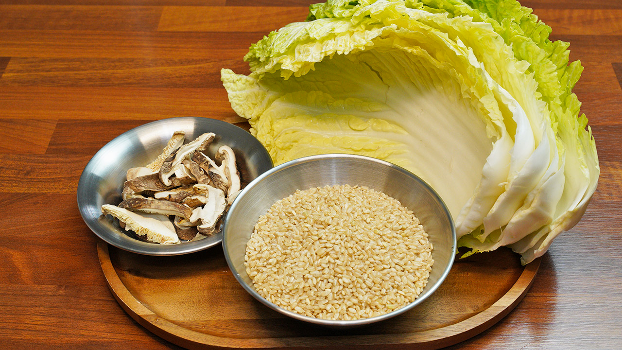 현미, 건 표고버섯, 배추, 달래, 다진 마늘, 고춧가루, 매실청, 양조간장