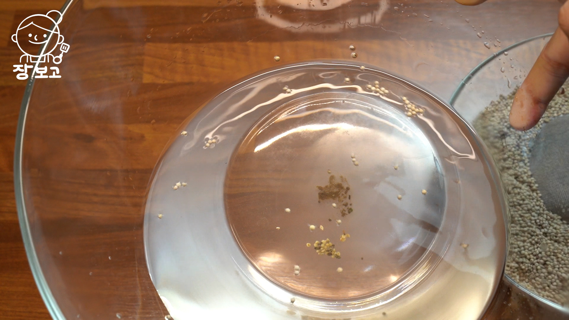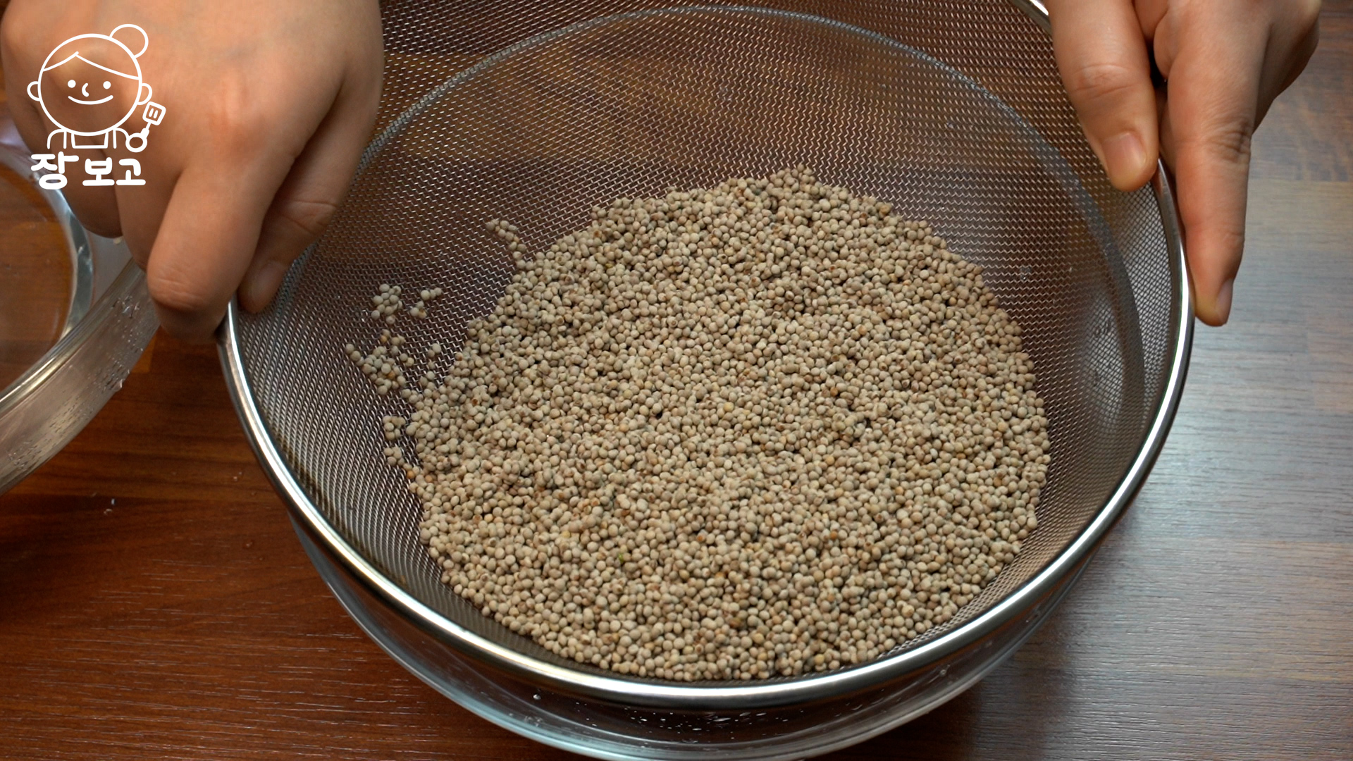 2. 세척이 끝난 들깨는 채에 밭쳐 물기를 뺀다.
