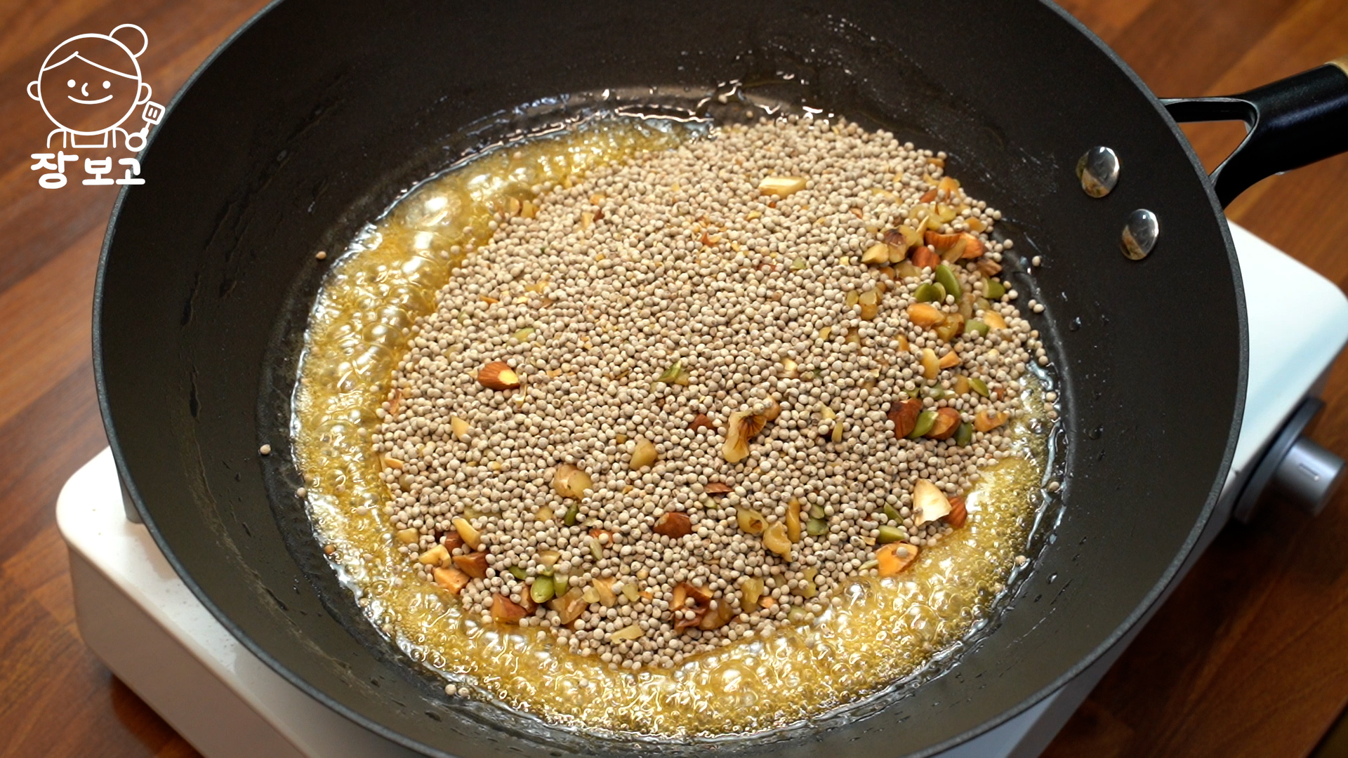 7. 젖은 견과류도 약불에 볶아 수분을 완전히 날린다. 수분을 완전히 날리지 않으면 견과류가 눅눅하고 강정이 무르다.