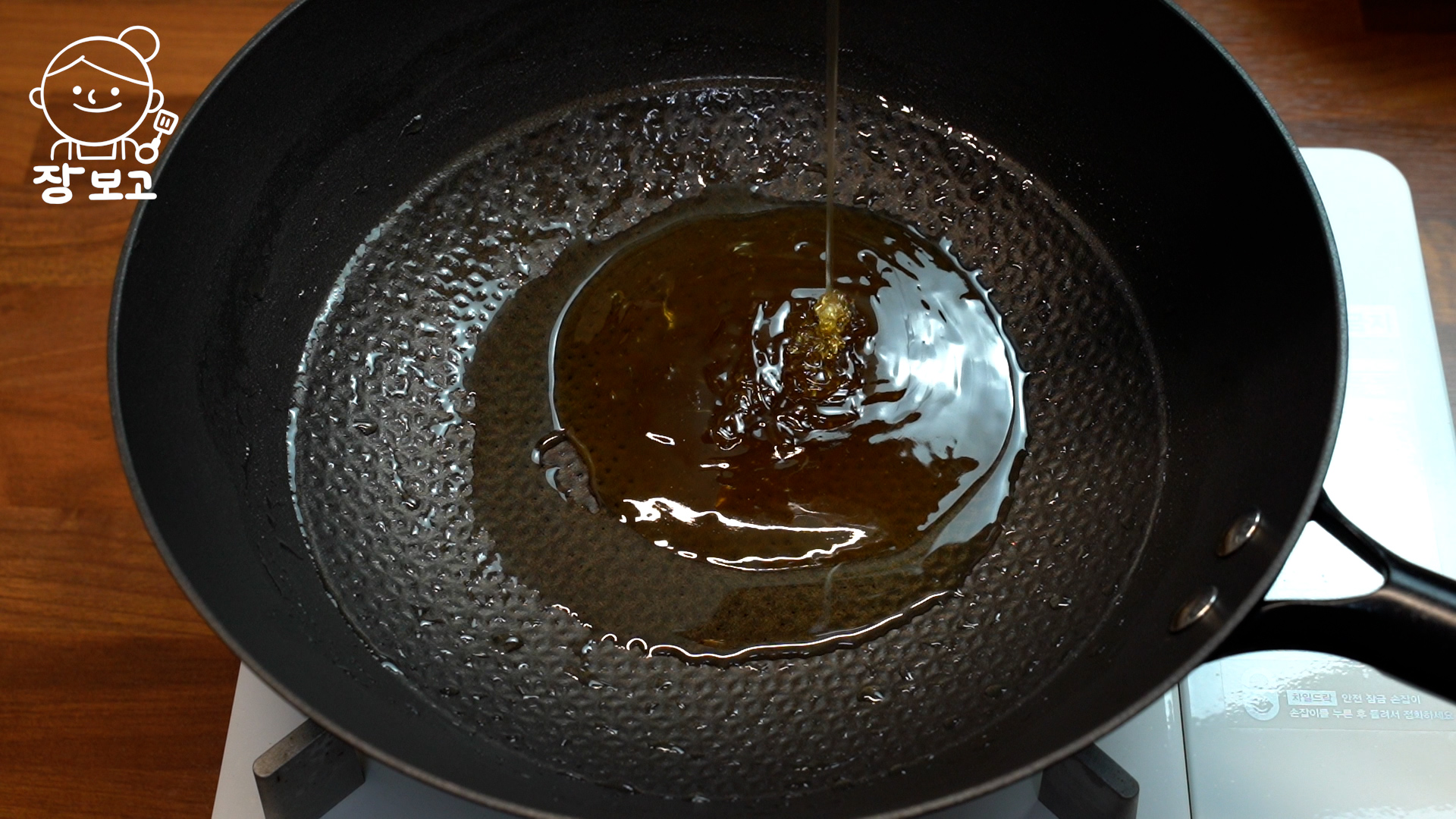 11. 웍에 식용유 2큰술 넣어 팬을 코팅하고 조청을 붓는다.