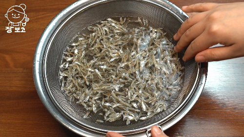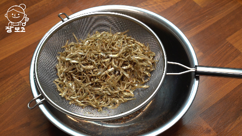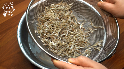 1. 멸치는 머리부터 꼬리까지 내장 제거할 필요 없는 잔멸치~ 중멸치 사용한다. 멸치는 채에 부어 물에 30초간 담갔다가 탈탈 털어준다. 이 과정에서 멸치의 짠맛을 뺄 수 있다.