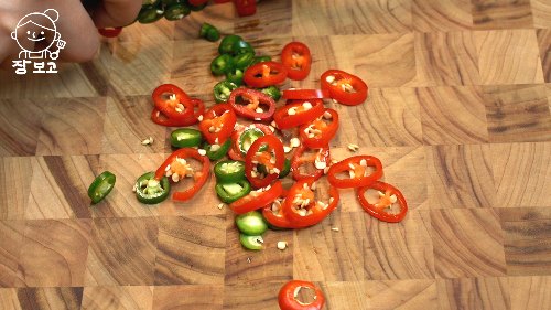 4. 매콤하게 먹고 싶다면 청양 고추 1개, 홍고추 1개 송송 썰고 위에서 후드득 떨어뜨려 씨를 대충 제거한다.