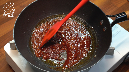 6. 불을 끄고 고추장 2큰술, 고춧가루 1/2큰술, 양조간장 1큰술, 미림 2큰술, 생강술 1큰술 넣어 섞어주고 약불에서 양념을 졸인다. 생강술이 없다면 미림 1큰술로 대체하면 된다.