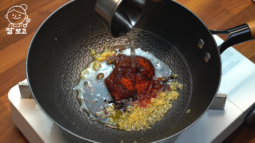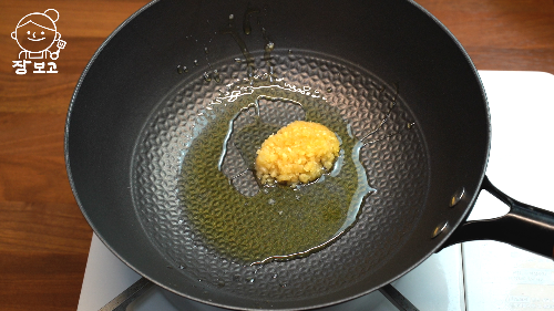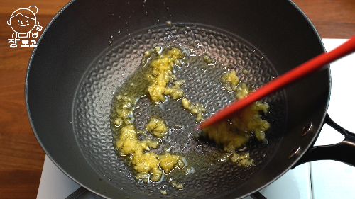 5. 팬에 식용유 3큰술과 다진 마늘 1큰술 넣어 약불로 볶아 마늘기름을 낸다.