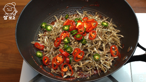 중멸치, 미림, 청양고추, 포도씨유, 다진 마늘, 고추장, 고춧가루, 무쇠웍